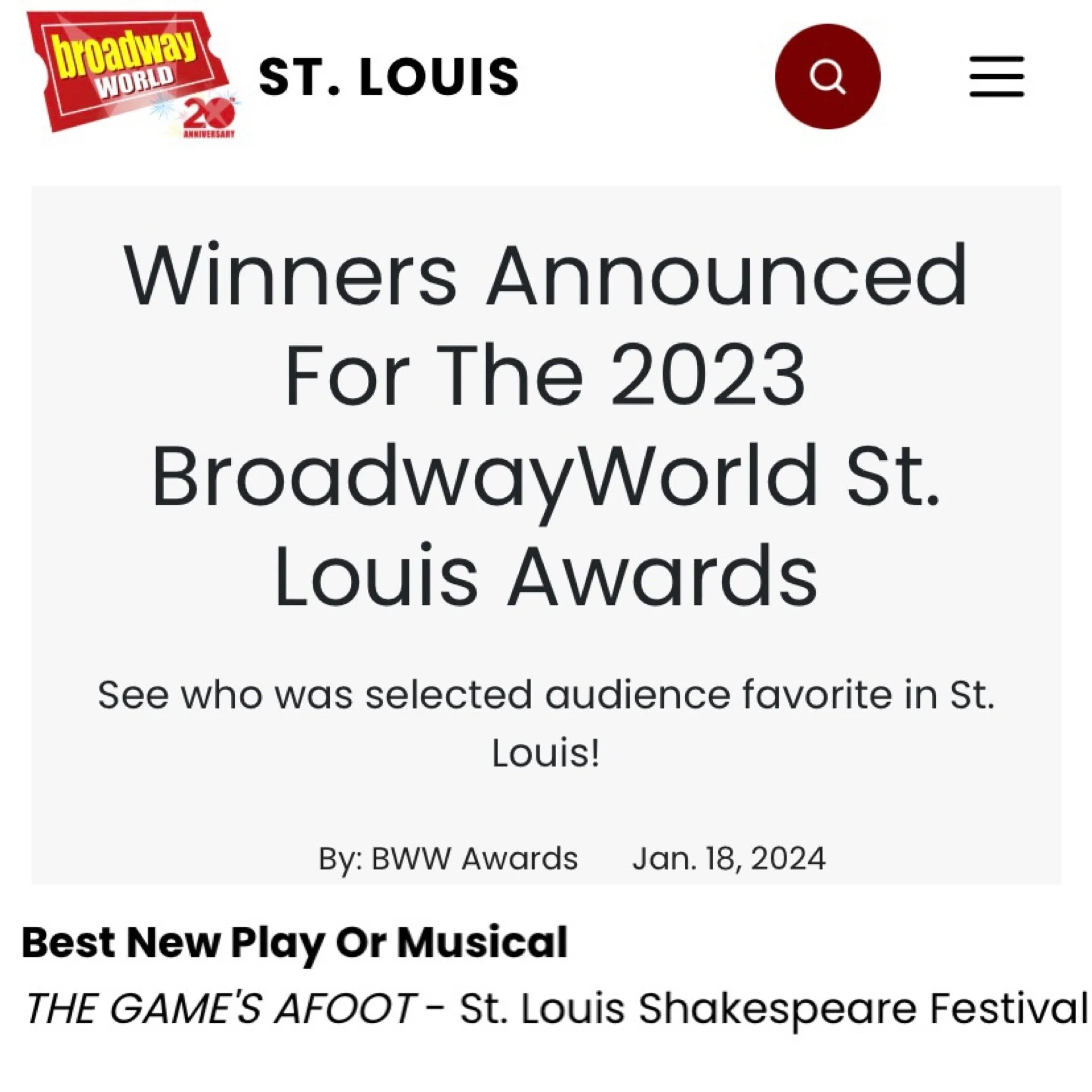 The people have spoken! The St. Louis Shakespeare Festival’s production of The Game’s Afoot won Best New Play Or Musical at the 2023 Broadway World St. Louis awards! Being part of this cast was magical, and telling the true history of soccer in St. Louis was an experience I won’t soon forget. Thank you to all the wonderful patrons who voted for us!